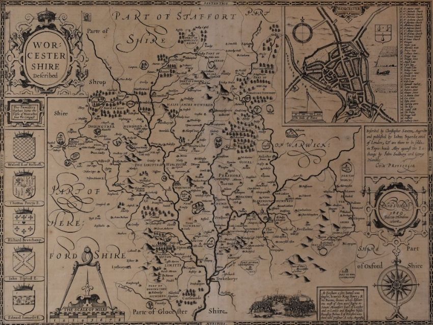 JOHN SPEED antique map - 'Worcestershire Described' uncoloured and in rear glazed frame, 40 x 51cms