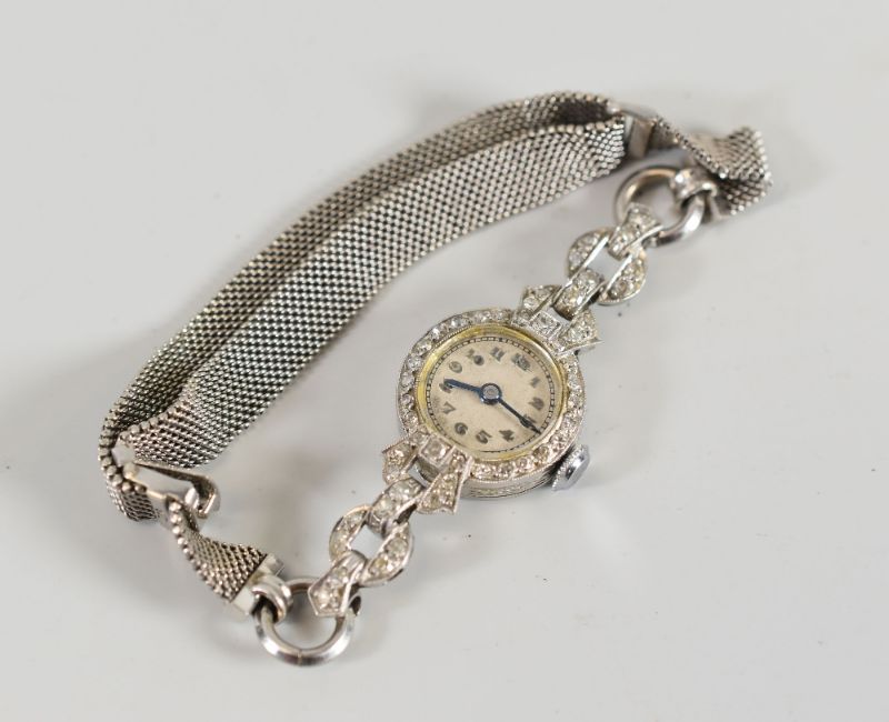 A LADIES VINTAGE COCKTAIL WATCH encrusted with diamonds, the white gold bracelet marked 9ct, the case believed to be platinum (inscribed but not hallmarked)