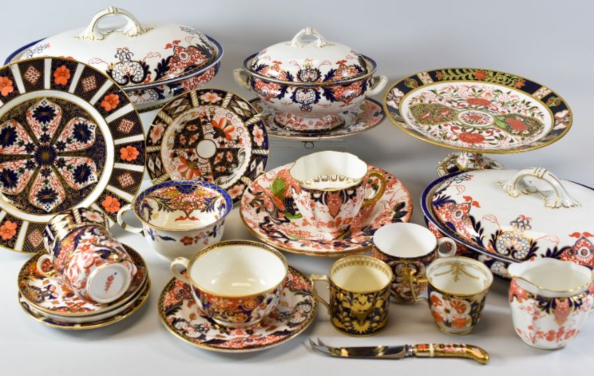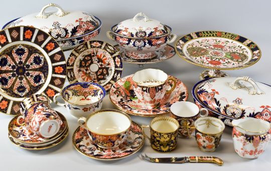 A MIXED PARCEL OF DERBY POTTERY & PORCELAIN from various periods and including a set of three graduated lidded tureens, moustache cup, tazza (repaired), cups and saucers etc
