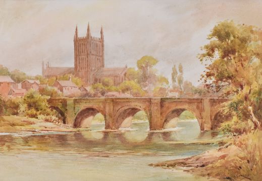 G GOODALL watercolour - river Wye and bridge with Cathedral, title to mount 'Hereford Cathedral', signed, 24 x 34cms