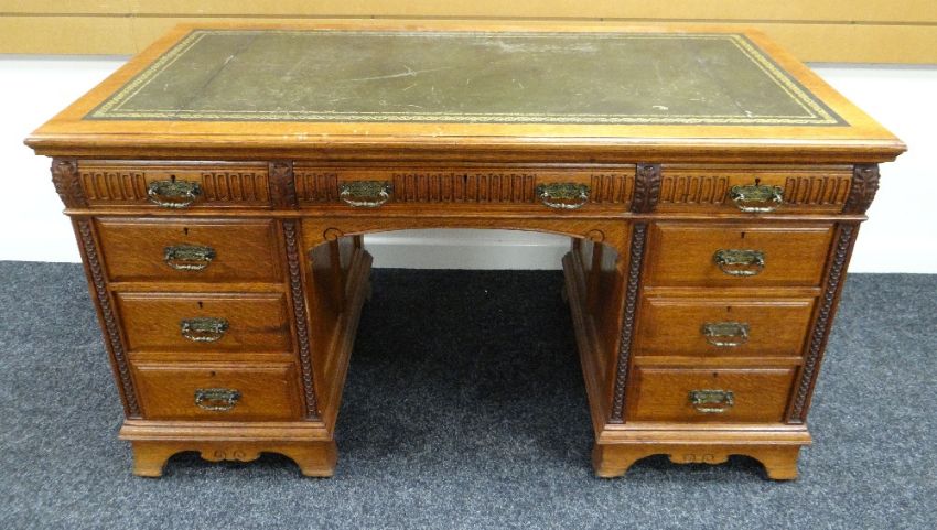 A GILLOWS OF LANCASTER KNEEHOLE DESK in medium coloured oak and having carved detail, tooled leather green top and composed of flanking banks of four drawers and a centre drawer with ornate brass handles, 137cms wide