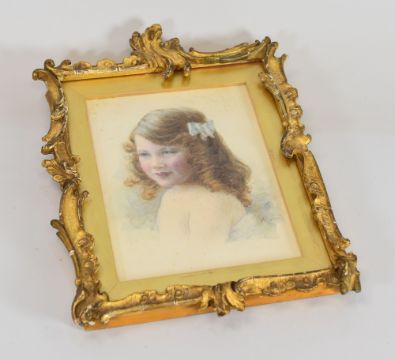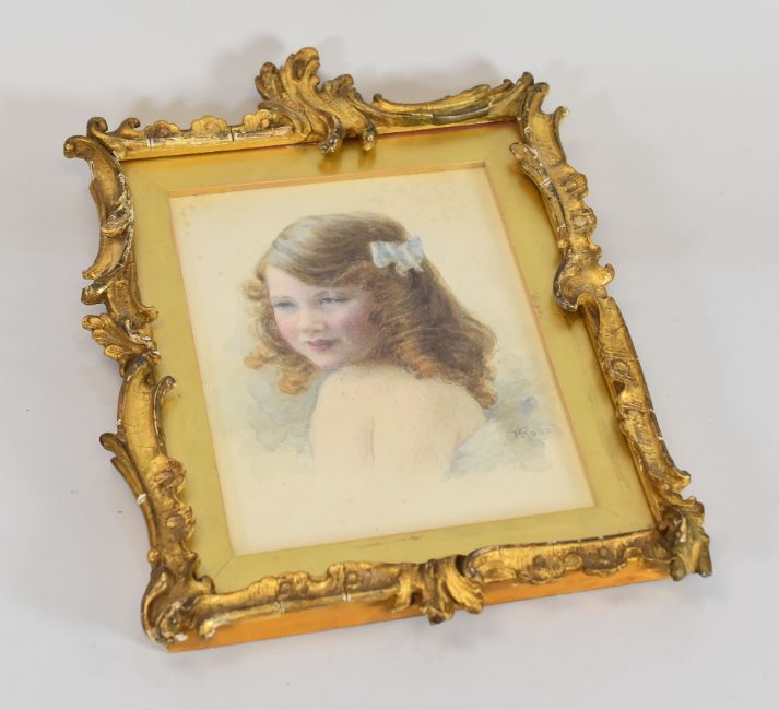 M ROSS watercolour - portrait of a young girl with blue ribbon in her hair, signed, 20 x 14cms