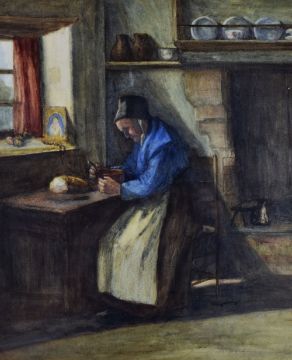 WELSH SCHOOL watercolour - interior with seated lady in Welsh costume, at a table with bread and pot of food, unsigned, 54 x 45cms Provenance: label verso with address as Suffolk House, Llandaff Road, Cardiff - an historic mansion which recently sold to developers
