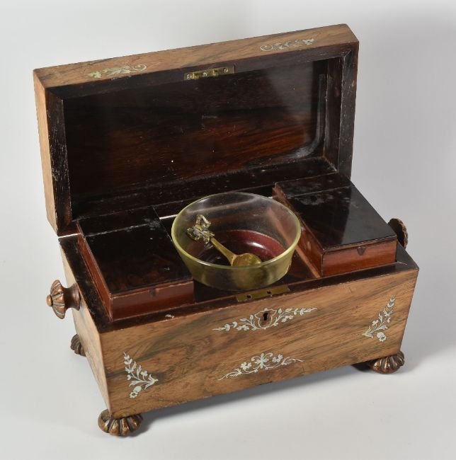 A GEORGIAN ROSEWOOD TEA-CADDY of sarcophagus form and having mother-of-pearl floral decoration, raised on four fluted bun feet and the interior with pull-out tea caskets with hinged lids, (faded), 30cms wide