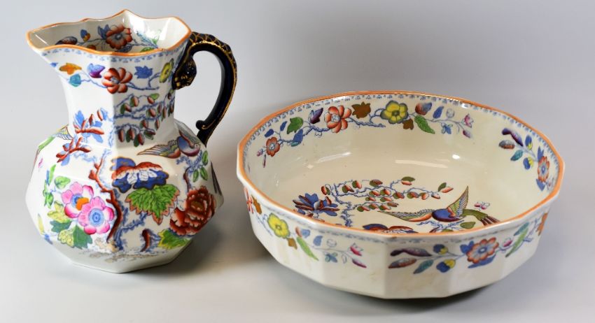 A MASONS IRONSTONE JUG & BASIN of faceted form and decorated with flowers and exotic colourful birds, the jug with serpent-form handle, 41cms diam