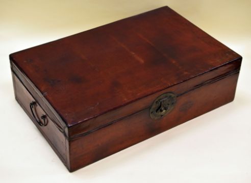 A CHINESE TRUNK IN PIG-SKIN LEATHER with two handles and printed interior, 76cms wide