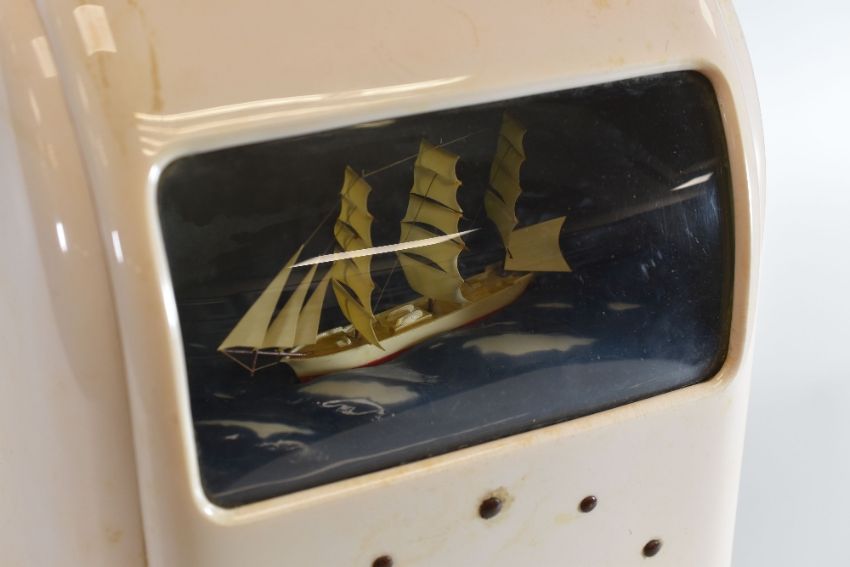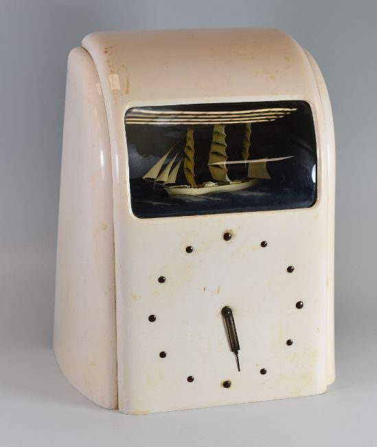 A VITASCOPE AUTOMATON CLOCK with a three masted ship at sail within a white Bakelite case (missing dial parts), 32cms high