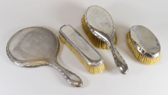 THREE MATCHING SILVER DRESSING TABLE ITEMS comprising two brushes and mirror with engraved floral decoration together with a non-matching similar brush