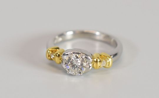 A PLATINUM & YELLOW GOLD DIAMOND SOLITAIRE RING, the diamond raised in a five claw setting, visual estimate 0.55ct approx, 5.25gms
