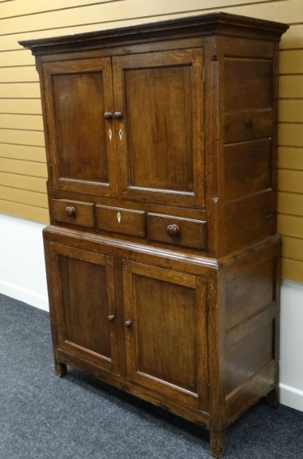 A GOOD NINETEENTH CENTURY WELSH OAK PRESS CUPBOARD OF SMALL PROPORTIONS composed of a two-door cupboard base below three deep centre drawers and a two-door cupboard top, having bone escutcheons and mahogany turned knobs, circa 1830, 112 x 173cms
