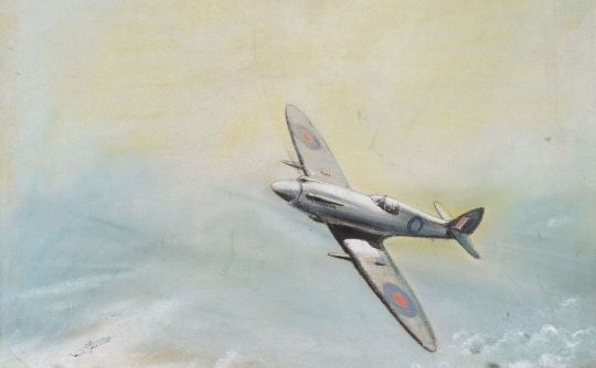 A F D BANNISTER watercolour - portrayal of WWI sea-battle, entitled 'Jutland Warspite and Warrior 6.30pm May 31st 2016', signed and dated 1923, 20 x 38cms; together with an unframed pastel drawing of a Spitfire in flight, 27 x 39cms