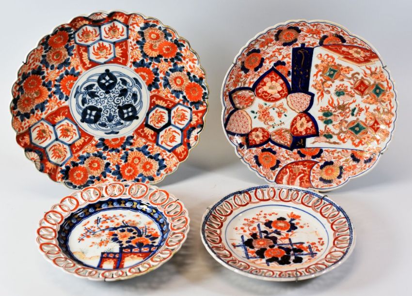 FOUR ITEMS OF JAPANESE IMARI comprising two near matching ribbon plates and two lobed chargers, all typically decorated, largest charger 31cms diam