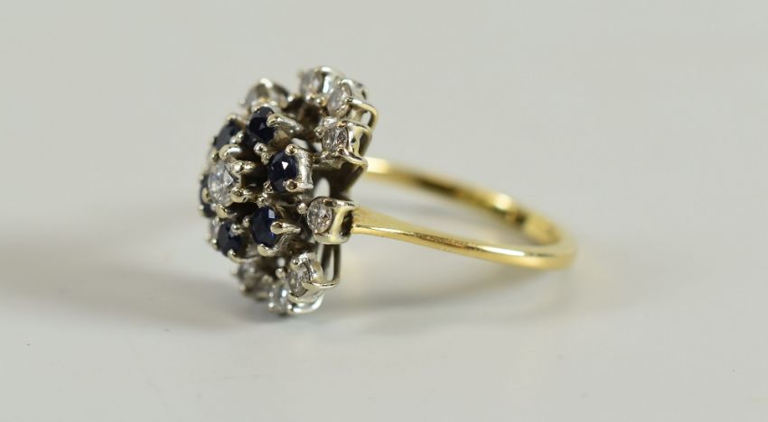 A DIAMOND & SAPPHIRE ABSTRACT RING set in 18ct yellow gold, 5gms