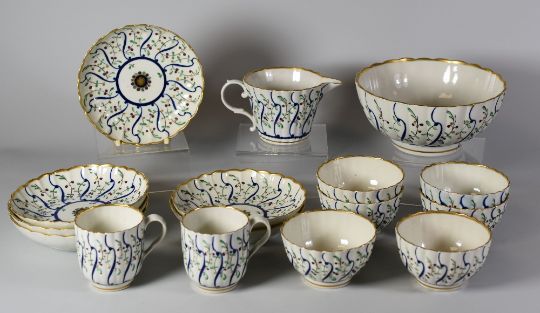 A RARE FLIGHT PERIOD WORCESTER PART TEA-SERVICE comprising footed sugar-basin, a cream-jug, six tea-bowls, pair of coffee-cans and six saucers, all of matching lobed form and decorated with cobalt-blue vertical swirls, stylised multi-coloured sprigs, interior cartouches and with gilded rims, bold blue crescent mark to bases, circa 1780s Provenance: to accompany the service, 1970s letters of correspondence between vendor and The Dyson Perrins Musuem where T Holloway the then Assistant Curator tells of the fact that 'Mr Sandon had not seen the blue pattern before....'