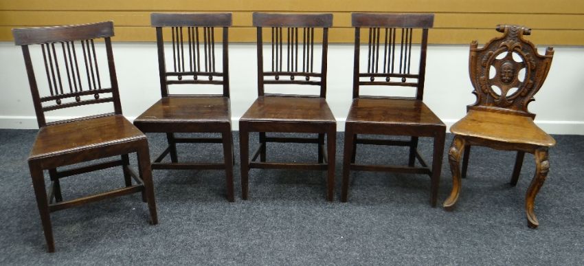 A SET OF FOUR FARMHOUSE CHAIRS AND A CARVED HERALDIC HALL CHAIR