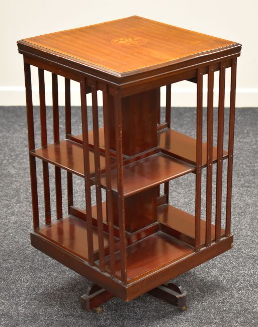 AN INLAID MAHOGANY REVOLVING BOOKCASE of cubic form and having a marquetry cartouche