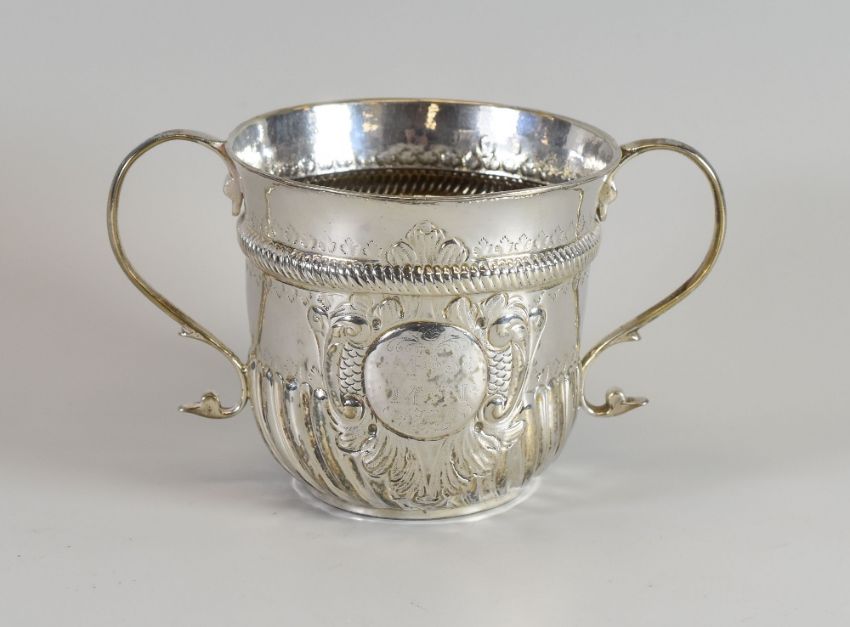 A GEORGE III BRITANNIA STANDARD SILVER PORRINGER with fluted lower body, gadrooned band and with marriage engraving 'MS - MN 1720', marks believed to be London 1720, 9.75cms high, 6.17ozs