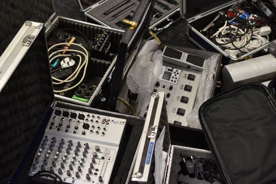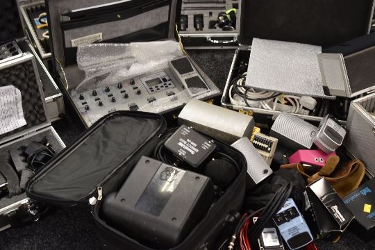 A PARCEL OF VARIOUS CASED GUITAR EQUIPMENT including leads, mics, wah wah pedals and wireless systems etc