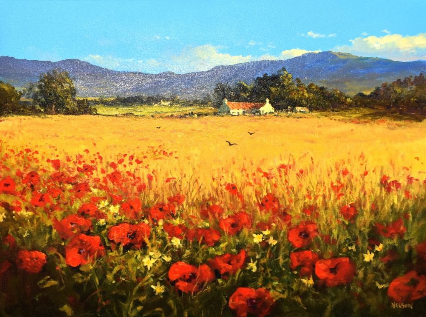 ALLAN NELSON oil on canvas - expansive landscape on a bright day and with farmstead amongst trees, entitled 'The Poppy Sunshine', signed, 75 x 100cms Provenance: certificate of authenticity