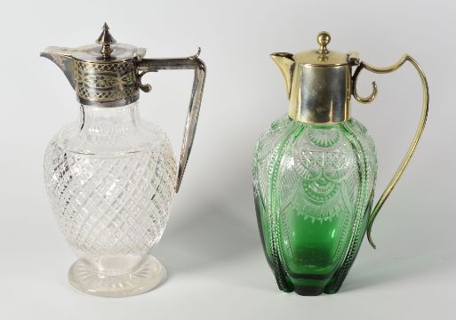 TWO CUT-GLASS & EPNS CLARET JUGS being a green tinted example and a clear hobnail example