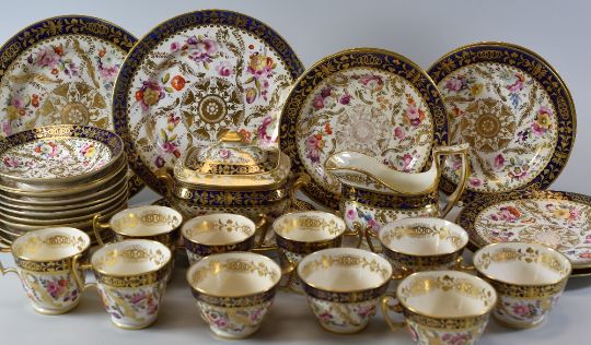 AN EXTENSIVE NINETEENTH CENTURY TEA-SET profusely decorated with flowers and gilding within a cobalt-blue reserve border, no factory marks probably Staffordshire, 36 pieces total