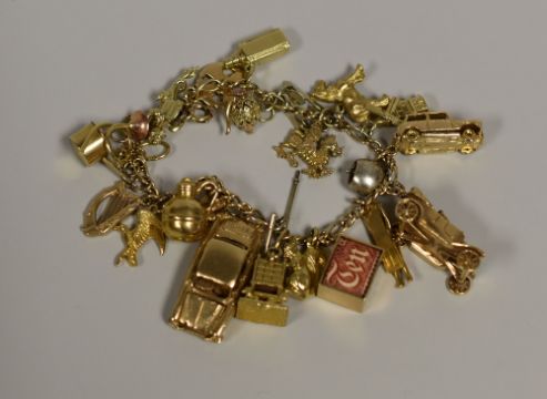 A 9CT GOLD CHARM BRACELET with approximately eighteen 9ct charms 60gms gross