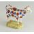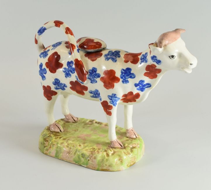 A SWANSEA POTTERY COW CREAMER standing on a grassy base, with looped tail as handle and decorated with sponged red and blue enamels (restored), 18cms long