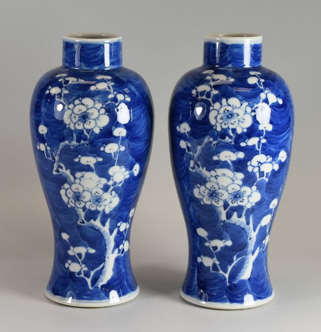 A PAIR OF CHINESE BALUSTER VASES with prunus decoration and with six character marks to the base, 25cms high