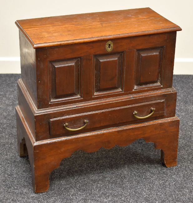 AN EARLY NINETEENTH CENTURY COFFER BACH raised on bracket feet with base drawer and tri-panelled facade, 58 width x 28 depth x 61cms high