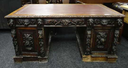 A CARVED OAK PARTNER'S DESK having an arrangment of three drawers and two cupboards on both sides and with tooled leather top, 70cms high x 153cms wide Provenance: from Grade II listed 18th Century house, The Hill in Abergavenny, former home of horticulturist John Wedgwood, son of Josiah