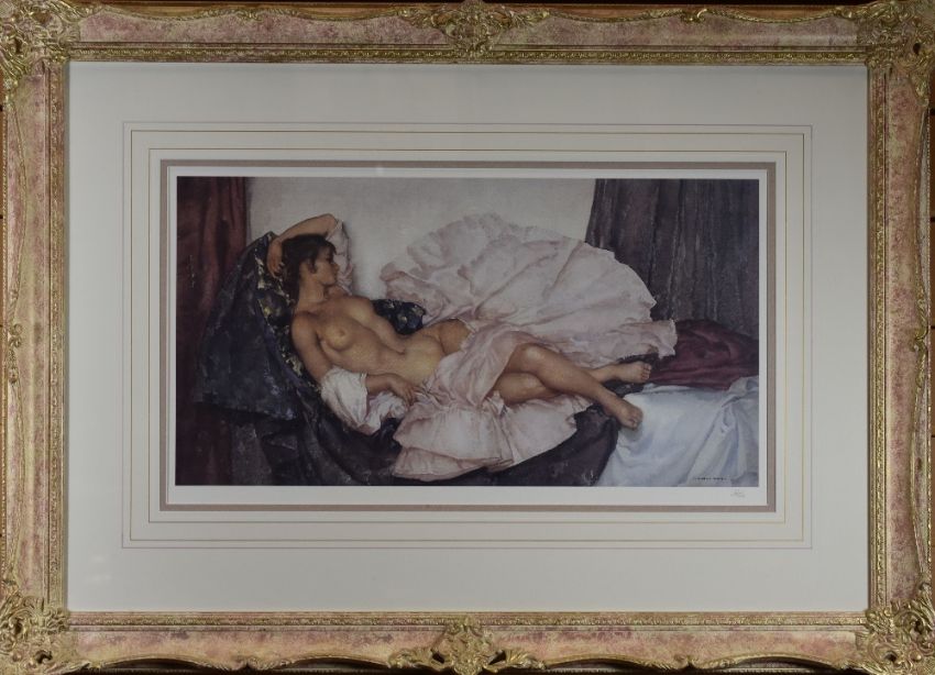 SIR WILLIAM RUSSELL FLINT RA limited edition (137/750) official print by Sir William Russell Flint Ltd - reclining lady partly clothed in Flamenco dress, embossed with WRF stamp, 30 x 54cms