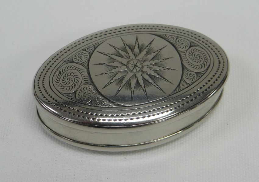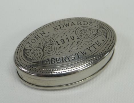 AN OVAL WHITE METAL TOBACCO BOX with hinged lid, the base and lid with sgraffito decoration and inscribed JOHN EDWARDS, 1910, ABERYSTWYTH, and with maker stamped inside as SAM THOMAS TREHERBERT, 7cms long