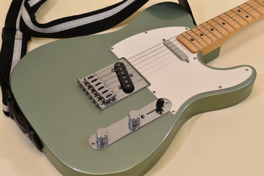A FENDER TELECASTER ELECTRIC GUITAR in sage green with white scratchplate, serial number MZ2013616 in rigid carry case, 97cms long