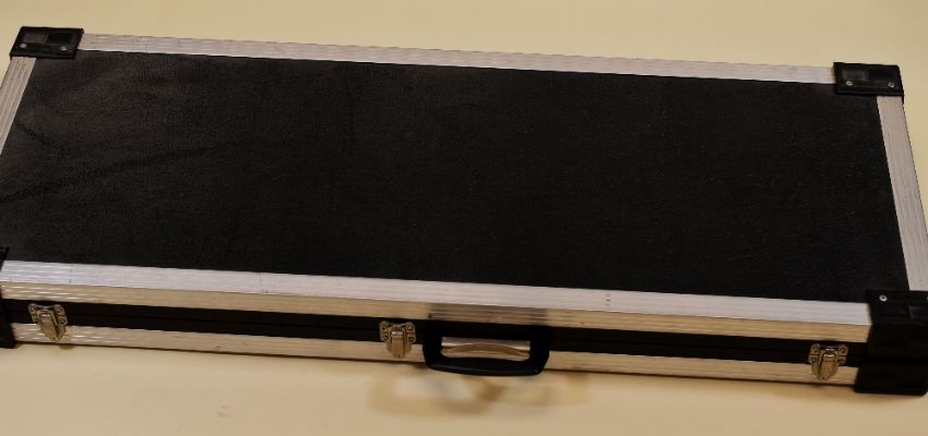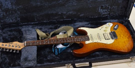 A COXX CLASSIC ELECTRIC GUITAR in wood with cream scratchplate in rigid carry case, 98cms long