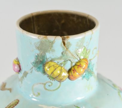 A RARE CHINESE POTTERY VASE of baluster form with narrow neck in turquoise ground and with the body unusually applied with ornaments in relief including a pendulum clock, a crane, insect, vases etc, believed late eighteenth century, no marks to base, 32cms high (repaired to damage to neck)