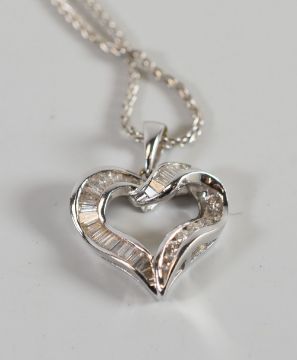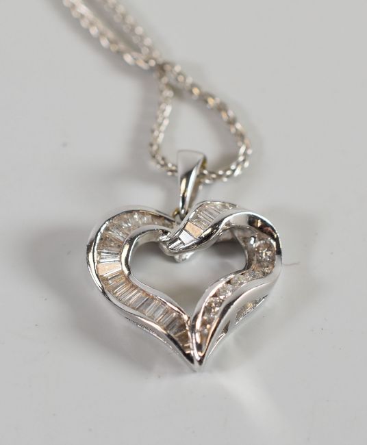 A CONTEMPORARY MULTI-DIAMOND HEART-SHAPED PENDANT & NECKLACE in 18ct white gold, the diamonds being a combination of baguette and round cut stones, 7.76gms total