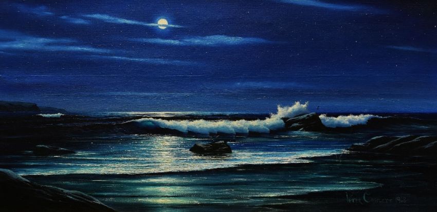 PETER COSSLETT oil on board - night time coastal scene with moonlit waves, signed and dated 1968, 50 x 101cms