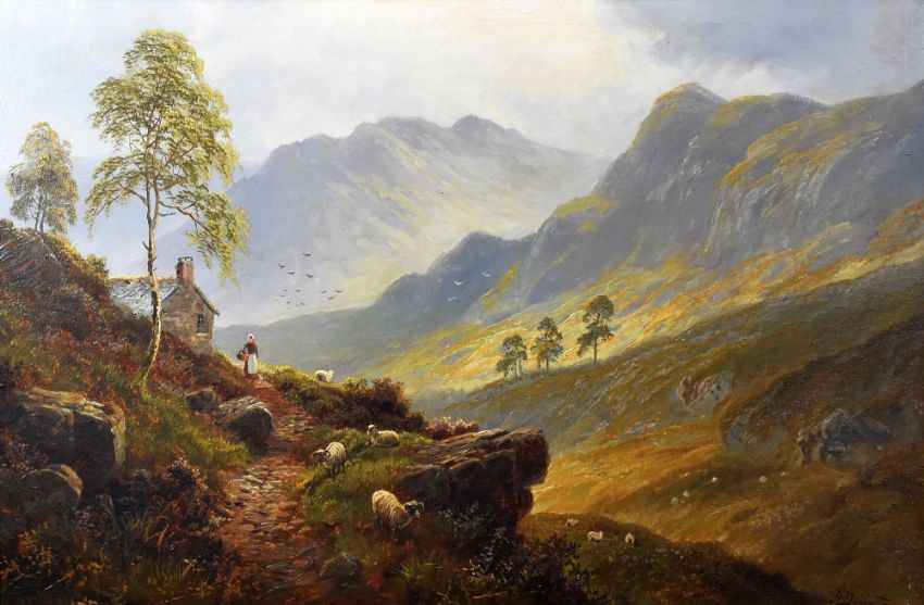 ALBERT DUNINGTON oil on canvas - mountainous landscape, believed Scottish Highlands, with cottage, figure and black-face horned sheep, signed, 49 x 75cms
