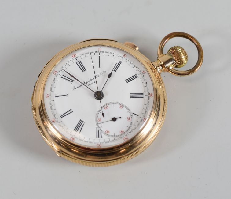 A 14K YELLOW GOLD SWISS OPEN-FACE POCKET-WATCH BY 'TIMING & REPEATING WATCH CO' being a rare repeater chronograph and having Roman numerals to the white enamel dial and with subsidiary dial, No. 48380, 102gms