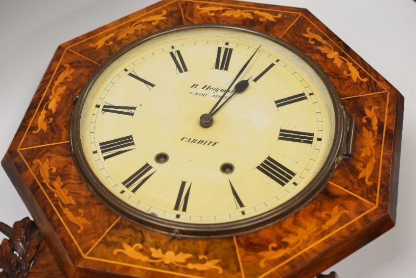 A WALNUT ENCASED EIGHT DAY PENDULUM WALL CLOCK with marquetry decoration and carved oak laurel mounts, the dial of octagonal form bearing Roman numerals to the white dial and inscribed R Heitzman, St Mary's Street, Cardiff, 57cms high