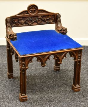 A CONTINENTAL CARVED ECCLESIASTICAL CHAIR with gargoyle creature arms and naturalistic back with Christian cross medallion