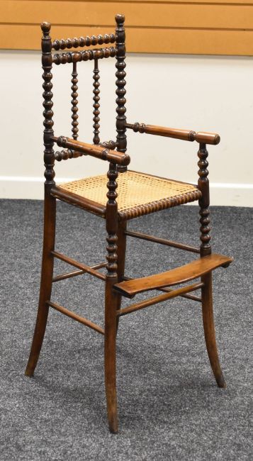 A LATE NINETEENTH CENTURY MAHOGANY CHILD'S HIGH-CHAIR having a footrest and bobbin supports and with cane work seat, possibly Welsh origin, 100cms high