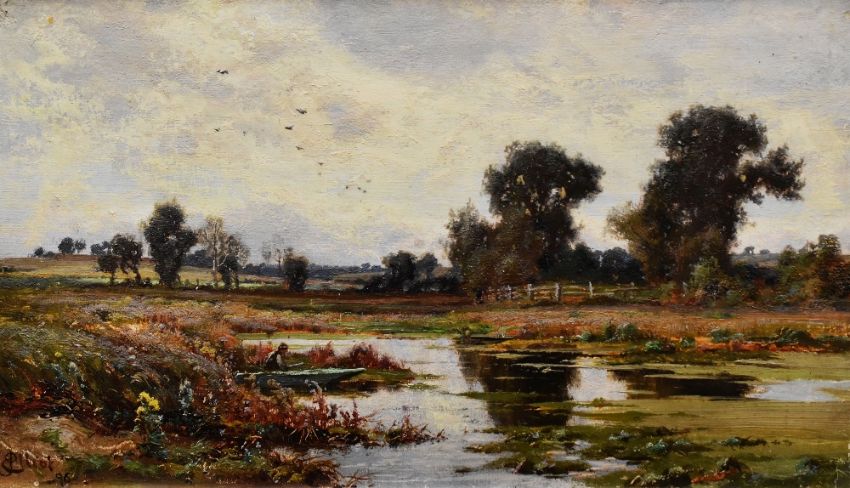J ELLIOT oil on board - marshland with figure in rowing boat, signed and dated (18)96, 29 x 49cms