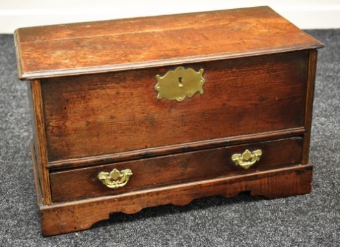 AN OAK COFFER BACH circa 1780/1800 having a single base drawer and lidded top with brass furniture, 68cms wide