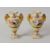 A PAIR OF CHELSEA PORCELAIN MINIATURE VASES of campana form on square bases with gilded goat-head handles, both sides of each decorated with exotic birds in gardens and with floral posies to the fluted necks, 13cms high (restoration)