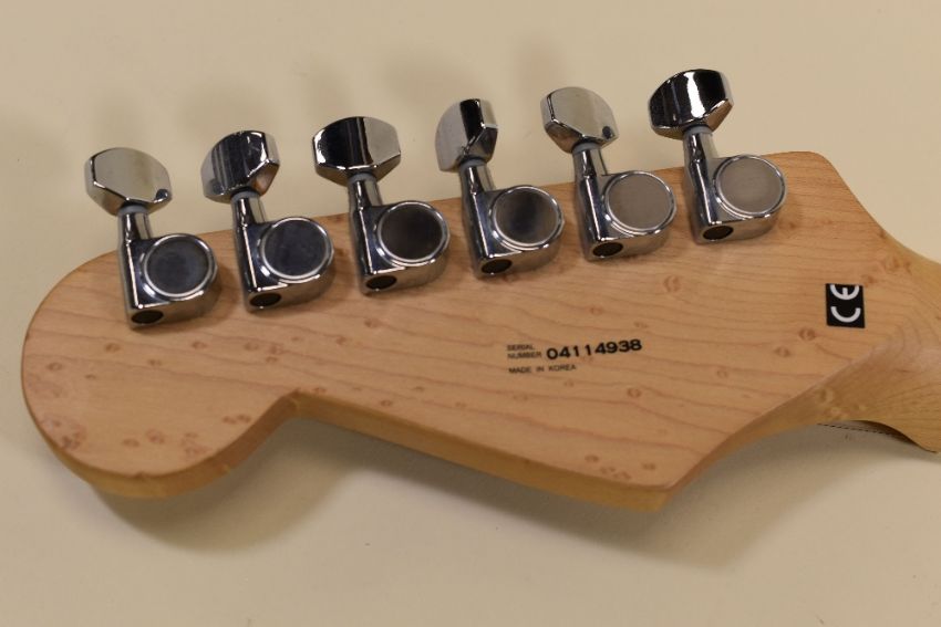 A FENDER ELECTRIC GUITAR varnished wood with black scratchplate together with carry case, serial number 04114938, 100cms long