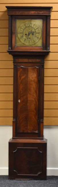AN EIGHTEENTH CENTURY LONGCASE CLOCK BY JOSEPH WILKINSON OF WIGTON in mahogany and having a brass dial bearing Roman numerals within a square hood over a trunk with shaped door and flanking Corinthian quarter-columns, 207cms high