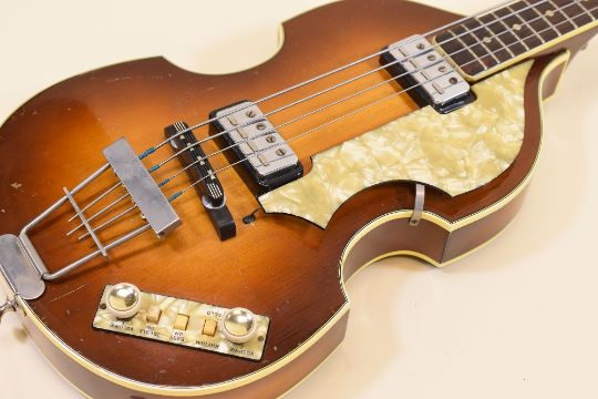A HOFNER ELECTRIC GUITAR with mother of pearl banding and decoration together with carry case, 110cms long