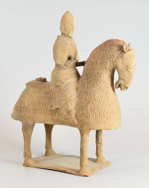A CHINESE ARCHAIC TERRACOTTA TOMB-HORSEMAN with sgraffito patterned horse and having a incense holder to the rear and standing on a rectangular base, 27cms high