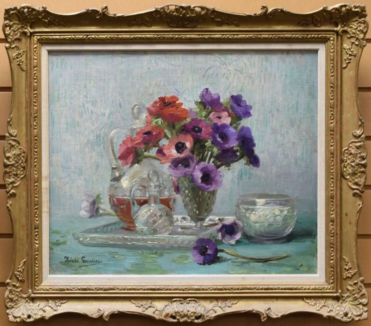 JANE NEREE-GAUTIER (French 1877 - 1948) oil on canvas- cut-flowers in a glass vase with decanter, signed, 45 x 54cms